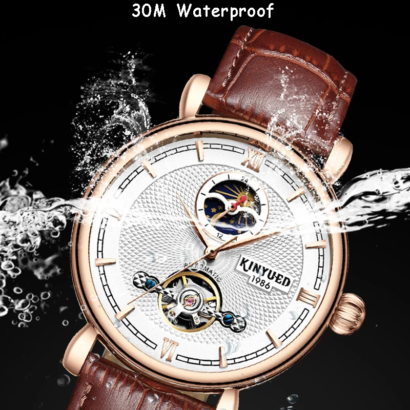 Achat Kinyued Nouvelle Mécanique Montres Hommes Automatique Phase de Lune Étanche Main Montre Tourbillon Mâle De Mode Bracelet En Cuir Montre Bracelet Pas Cher En Ligne