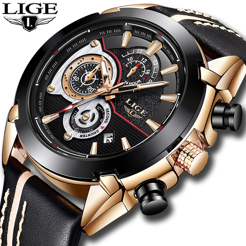 Vente LIGE Hommes Montres Top Marque De Luxe Quartz Montre En Or Hommes Occasionnels En Cuir Militaire Étanche Sport Montre Bracelet Relogio Masculino Pas Cher Prix