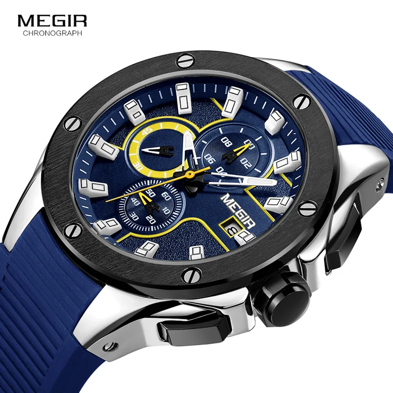 . Achat MEGIR Quartz Montres Hommes Top Qualité Fonctions Chronographe Sport Montre Étanche Bleu Silicone Bracelet En Caoutchouc Wristswatch Horloge Pas Cher En Ligne.